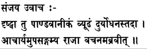 2. Sanjaya said: Having seen the army of the Pandavas drawn up in battle array, prince Duryodhana then approached his teacher and spoke (these) words: Duryodhana addresses Drona
