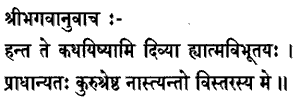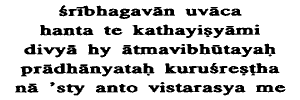 19. Now will I tell thee of My heavenly Glories, in their prominence, O best of the Kurus ; there is no limit to My extent.Now I will tell you of My heavenly Glories, in their prominence, i.e where they are severally the most prominent. It is not, indeed, possible even in a whole century to describe all of them, as there is no limit to the extent of My Glories.Now, listen to this, in the first place: