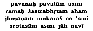 31· Of purifiers I am the wind, Rama of warriors am I, of fishes I am the shark, of streams am the Ganges.Of those who bear weapons I am Rama, Dasarathas son