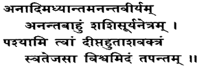 19. I see Thee without beginning, middle or end, infinite in power, of manifold arms ; the sun and the moon being Thy eyes, the burning fire Thy face ; heating the whole Universe with Thy radiance.
