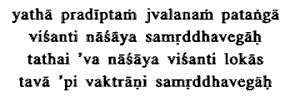 29. As moths hurriedly rush into a blazing fire for destruction, just so do these creatures also hurriedly rush into Thy mouths for destruction. The splendour of the Universal Form.