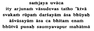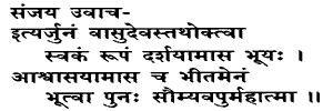 50. Having thus spoken to Arjuna, Vasudeva again showed His Own form ; and the Mighty Being, becoming gentle in form consoled him who was terrified. His Own: as born in Vasudevas family.