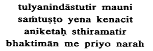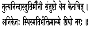 19. He who is the same to foe and friend, and also in honor and dishonor ; who is the same in cold and heat, in pleasure and pain ; who is free from attachment ; to whom censure and praise are equal ; who is silent, content with anything, homeless, steadyminded, full of devotion ; that man is dear to me.He has no attachment for objects of any kind. He is content with the bare means of bodily sustenance. It is said (in the Mahabharata): Who is clad with anything, who is fed on any food, who lies down anywhere, him the Gods call a brahmana. (Santi parva, MokshaDhrama, 24512) He has no fixed abode, he is houseless as has been said in another smriti. His thought is fixed steadily on the Supreme Reality.The enumeration, which was commenced in xii. 13, of the various attributes of the samnyasinsto the worshippers the Akshara who are constantly devoted to the knowledge of the Supreme Realityis concluded as follows: