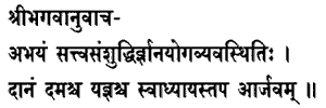 Fearlessness purity of heart, steadfastness in knowledge and Yoga ; almsgiving,