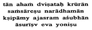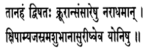 19. "Thus those evil persons who hate Me I will make them get born over and again or repeatedly in suitable demoniac births. To them there is no Paramatma Prapti or attainment of the Ultimate Self or Reality whatsoever.