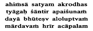 truth, absence of anger, renunciation, serenity absence of calumny, compassion