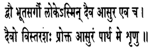 6. "All the creatures created in this world have one of these Sampats (set of propensities). Listen, as only when one gives up the Aasurisampat he can acquire the means for spiritual betterment, I will tell you about those (Aasurieesampat) propensities.