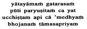 to the Tamasic.Stale: Halfcooked. Yatayama (lit. cooked three hours ago)