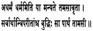 32. That which, enveloped in darkness, sees adharma as dharma and all things perverted, that intellect, O Partha, is Tamasic. It takes quite a perverted view of all things to be known. sattvic Firmness.
