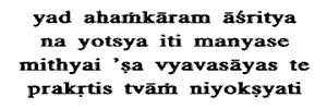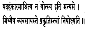 59. If, indulging egotism, thou thinkest will not fight, vain is this, thy resolve ; nature will constrain thee,Thinkest, resolves. Vain: for, thy nature as a Kshatriya will constrain thee to do so.Also because,