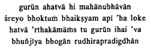 5. Better indeed in this. world to live even upon alms than to slay the teachers of high honor. But, were I to slay these teachers, I should only in this world enjoy the pleasures of wealth, delights stained with blood.
