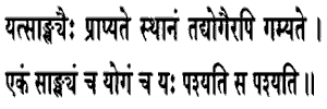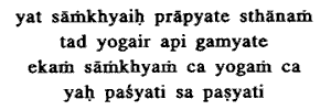 5. That state which is reached by Sankhyas is reached by Yogins also, He see, who sees Sankhya and Yoga as one.Sankhyas are those who are devoted to knowledge and have renounced the world They reach the state called moksha. The same state is reached by Yogins also,but indirectly through, the attainment of true knowledge and renunciation; by thosewho perform their duties as a means of attaining knowledge, dedicating them to the Isvara, and having no selfish end in view. That man sees rightly who sees that Sankhya and Yoga are one, as leading to an identical result.(Question;:If so Samnyasa must be superior to Yoga. How then is it that it has been declared that KarmaYoga is better than Karmasamnyasa ?(answer) ;Listen why it is so. It is the simple Karma samnyasa and the simple KarmaYoga with reference to which you have asked me which one is the better of the two ? in accordance with the question, My answer has been given without having regard to knowledgethat KarmaYoga. is superior to Karmasamnyasa. But that Samnyasa which is based upon knowledge is regarded by Me as Sankhya, and Sankhya itself is the true (paramartha) Yoga It is only by a figure that the Yoga through Vedic rites is called Yoga or Samnyasa, inasmuch as it conduces to that (true Yoga or Samnyasa),KarmaYoga i.e. a means to Samnyasa.How is it that the aim of the KarmaYoga is that (true Yoga or Samnyasa) ?Listen: