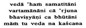 26. I know O Arjuna, the past and the present and the future beings, but Me nobody knows.Nobody knows Me, except that one man who worships Me and seeks refuge with Me. Just for want of knowledge of My real nature, nobody worships Me.The root of ignorance It may be asked, What is that obstacle to their knowledge of My real nature, whereby deluded, all creatures that are born know Me not ?Listen:From the delusion of pairs caused by desire and aversion, O Bharata, all beings are subject to illusion at birth, O harasser of thy foes, The very desire and aversion which are opposed to each other like heat and cold, and which, arising in connection with pleasure and gain and their causes, occur to every being in its turn, are known as pairs (dvandva). Now, when desire, and aversion arise on the occurrence of pleasure and pain or on the causes thereof they cause delusion in all beings and create obstruction to the rise of a knowledge of the Supreme Reality, the Self, by subjugation to themselves the intelligence of those beings. To one whose mind is subject to the passions of desire and aversion, there cannot indeed arise a knowledge of things as they are, even of the external world and it needs no saying that to a man whose intellect is over powered by passion there cannot arise a knowledge of the Innermost Self, inasmuch as there are many obstacles in its way. All creatures into existence are born subject to this delusion. Wherefore every being has its intelligence obscured by the delusion of pairs ; and thus deluded it knows not that I am the Self, and therefore worships Me not as the Self.Divine worship leads to realization.Who then are free from the delusion of pairs and know Thee and worship Thee as their Self according to the Teaching (Sastra) In answer to this, the Lord says