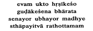 24. Sanjaya stated: " Thus addressed by Gudakesha (the conqueror of sleep, i.e., Arjuna); Hrishikesha, having stationed that best of chariots between the two armies,