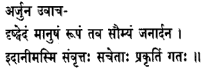 51. Arjuna said.Having seen Thy gentle human form, O Janardana now I have grown serene, and returned to my nature. Devotion as the sole means to the realization of the Universal form. The Blessed Lord said: