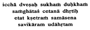 6. Desire, hatred, pleasure, pain, the aggregate, intelligence, courage ;the Kshetra has been thus briefly described with its modifications.Now, the Lord proceeds to teach that even those which the Vaiseshikas speak of as the inherent attributes of Atman (the Self) are merely the attributes of Kshetra (matter), but not the attributes of Kshetrajna (the knower of matter): Desire (ichchha) is that which impels a person who has once experienced a certain object of pleasure to seekon again perceiving an object of the same class; to get hold of this latter as conducive to pleasure. This, namely desire, is a property of the inner sense (antahkarana) ; and it is Kshetra (matter) because it is knowable. So also, hatred is that which leads a person, who once experienced a certain object of pain, to dislike an object of the same class on perceiving this latter. This, namely hatred, is only Kshetra (matter), because it is knowable. Pleasure is the agreeable, the tranquil, made up of the Sattva principle. Even this is Kshetra. because it is knowable. Pain is the disagreeable ; and it is Kshetra because it is knowable. The aggregate is the combination of the body and the senses. Intelligence is a mental state which manifests itself in the aggregatejust as fire manifests itself in a burning realistic mass; pervaded by the semblance of the consciousness of the Self. It is Kshetra, because it is knowable. Courage is that by which the body and the senses are upheld when they get depressed ; and it is Kshetra because it is knowable.Desire and other qualities mentioned here stand for all the qualities of the inner sense (antahkarana). The Lord concludes the present subject as follows: the Kshetra bas been thus briefly described; with its modifications such as Mahat (Buddhi).