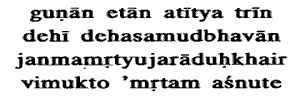 The wise man crosses, while still alive, beyond the three gunas which constitute