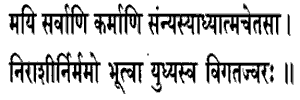 30. Renouncing all action in Me with thy thought resting on the Self, being free from hope, free from selfishness, devoid of fever, do thou fight.To Me, Vasudeva, the Divine Being, the Supreme Lord, the Omniscient, the Self of all, surrender all actions, with the wise thought that I, the agent, do this for the Isvaras sake as his liege: Fever: anguish, grief.