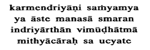 the organs of action, sits thinking in his mind of the objects of the senses,